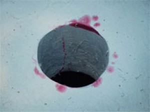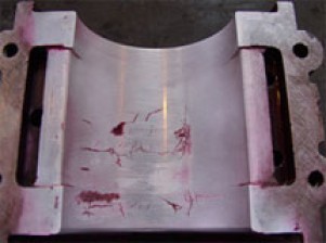 Beispiele einer "Rot-Weiss" Farbeindringprüfung und die Fehleranzeige. Die roten Ausblutungen machen die Fehler auf dem weissen Kontrastuntergrund deutlich sichtbar.